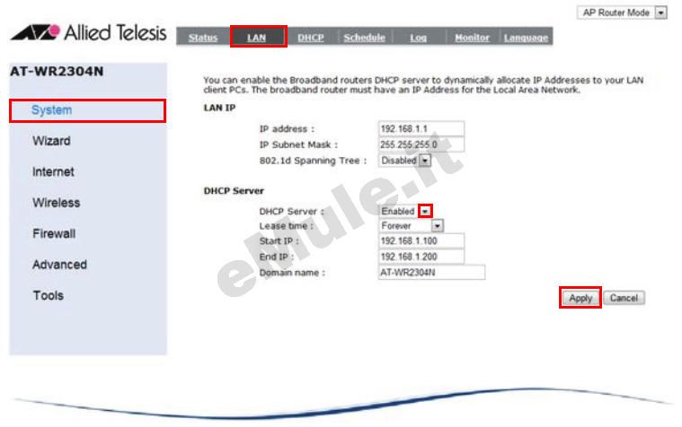 cliccate System - > LAN e controllate che sia selezionato Enable alla voce DHCP Server, cliccate Apply: