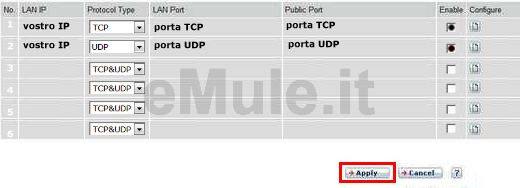in LAN Port e Public Port scrivete la porta TCP del vostro eMule,