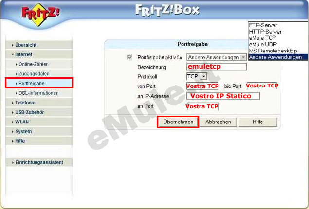 Controllate che su Portfreigabe aktiv fur (Port Forwarding enable for - Abilitazione Porta attiva per) ci sia la spunta, dal menù a tendina selezionate Andere Anwendungen (Other Application - Altra Applicazione - Port Forwarding enable for) e procedete a creare la prima regola, quella relativa alla vostra porta TCP che leggete in eMule -> Opzioni -> Connessione :