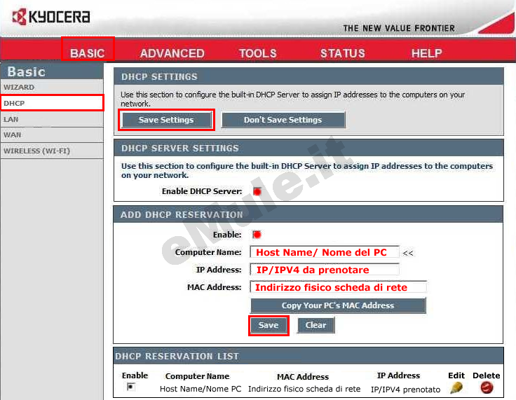 Controllate nella tabella che l' associazione IP/IPV4 - MAC Address sia esatta, se non lo fosse cliccate l' icona con la matita (per modificare) o l' icona rossa (per cancellare), rieditate correttamente e al termine cliccate Save Settings.