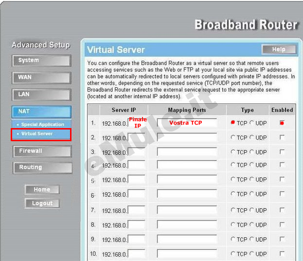Selezionate Virtual Server e procedete ad inserire la prima regola, quella relativa alla porta TCP di eMule -> Opzioni -> Connessione: