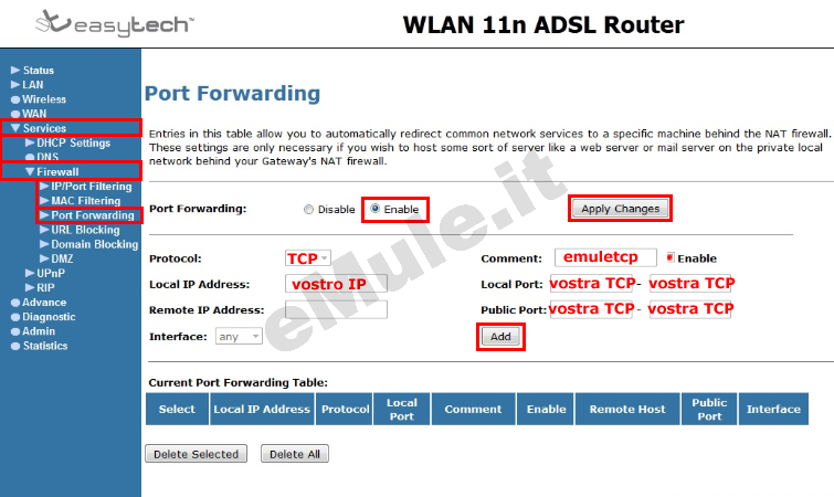 Questo modello non permette la prenotazione dell'Ip usando il DHCP, quindi per il corretto funzionamento di eMule è necessario fissare un IP al PC, seguendo la guida sull' IP statico in base al vostro sistema operativo e disattivare il DHCP.