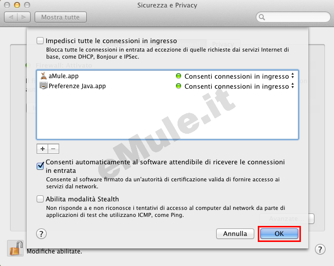 Spuntate Consenti automaticamente al software attendibile di ricevere le connessioni in entrata, darete così l' autorizzazione a tutte le applicazioni firmate da una autorità di certificazione valida, aMule non è tra queste per cui dovrete aggiungerla.