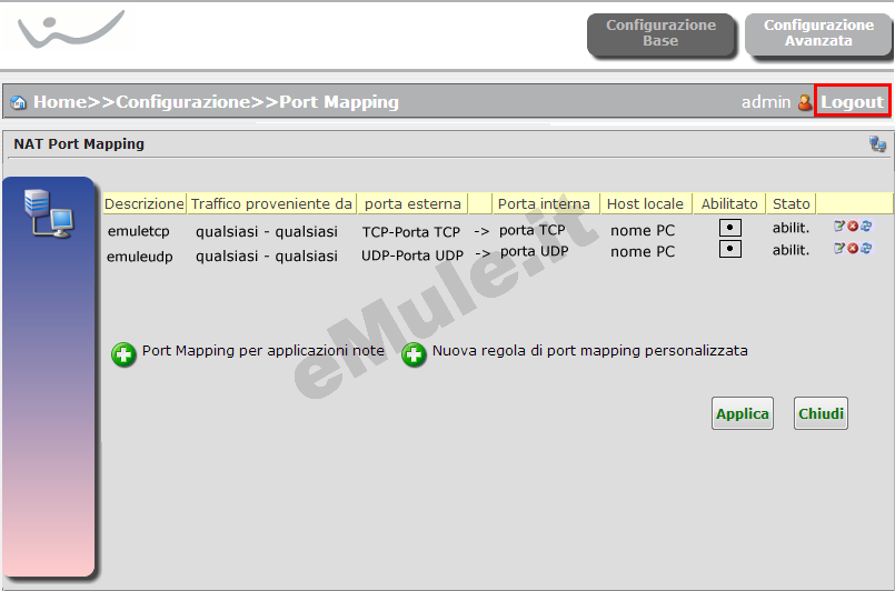 Uscite dalla configurazione cliccando in alto la voce Logout