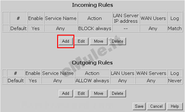 cliccate ora su Add, cliccate la tendina Service selezionate uno dei due servizi che avete precedentemente creato, inserite l' IP del vostro PC dalla tendina Send to LAN Server, con ALLOW Always dalla tendina Action. Ripetete l'operazione per ciascuna delle due regole.