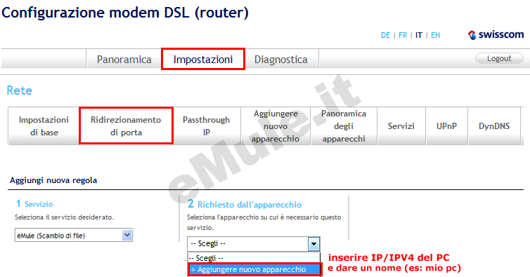 Questo modello non permette la prenotazione dell'Ip usando il DHCP, quindi per il corretto funzionamento di eMule è necessario fissare un IP al PC, seguendo la guida sull' IP statico in base al vostro sistema operativo e disattivare il DHCP.