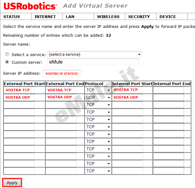 In External Port Start - External Port End- Internal Port Start scrivete il numero della porta UDP che troverete in Opzioni --> Connessione di eMule
